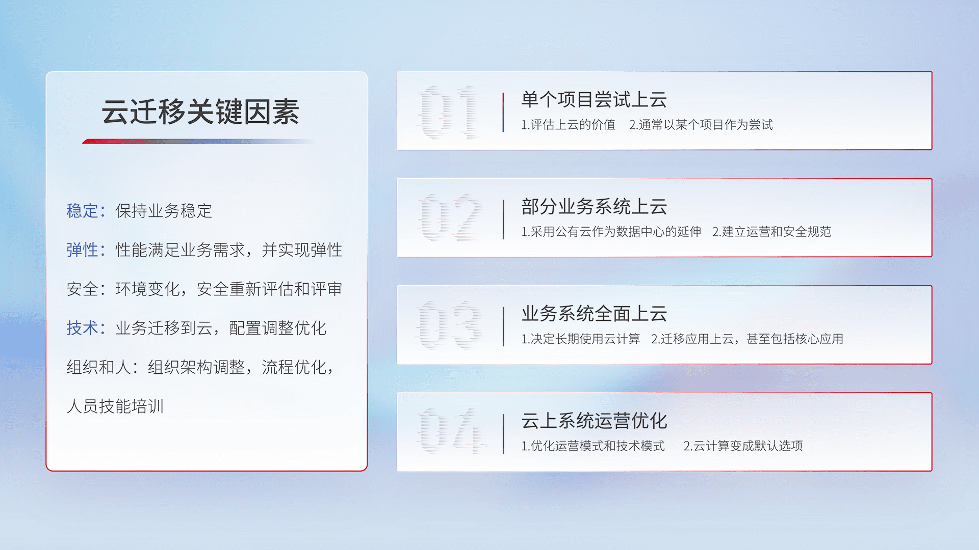 结合实际业务,,,从规划设计、、、、云平台选型、、云原生改造、、数据迁移、、、、集成交付,,迁移全过程为客户识别最佳上云路径,,,做好风险识别管理,,,设计网络架构、、、身份权限、、安全审计合规、、、、操作审计、、、日志审计、、、、监控告警策略、、、多站点容灾设计等,,对云上基础设施进行整体规划,,提升IT治理水平,,,以满足弹性、、高可用、、高性能的需求。。。。